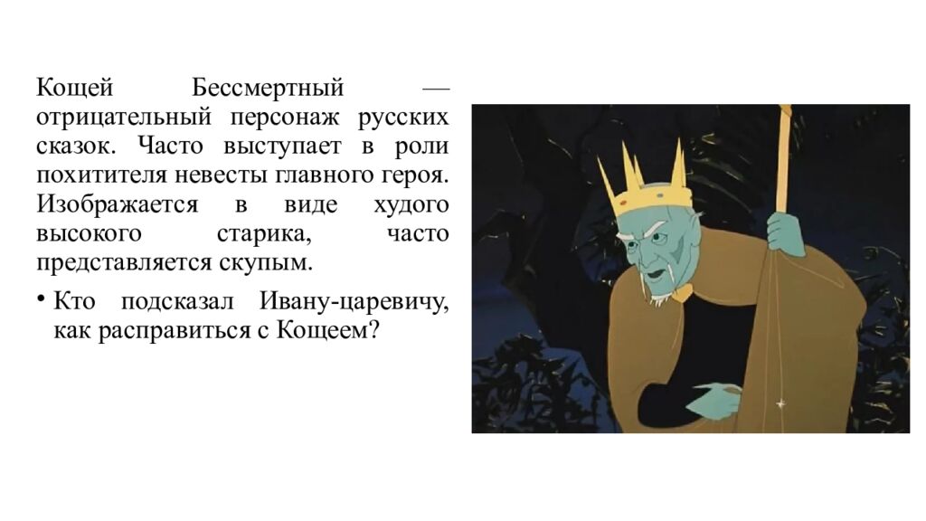 Кощей Бессмертный — отрицательный персонаж русских сказок. Часто выступает в роли похитителя невесты главного героя. Изображается в виде худого высокого старика, часто представляется скупым. Кто подсказал Ивану-царевичу, как расправиться с Кощеем ?