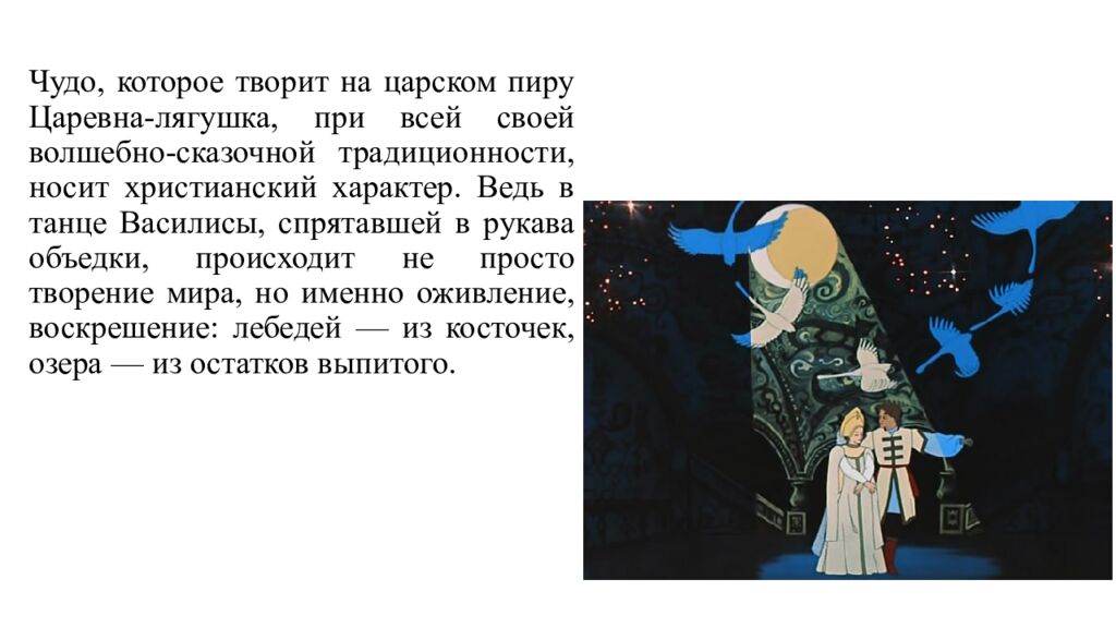 Чудо, которое творит на царском пиру Царевна-лягушка, при всей своей волшебно-сказочной традиционности, носит христианский характер. Ведь в танце Василисы, спрятавшей в рукава объедки, происходит не просто творение мира, но именно оживление, воскрешение: лебедей — из косточек, озера — из остатков выпитого.