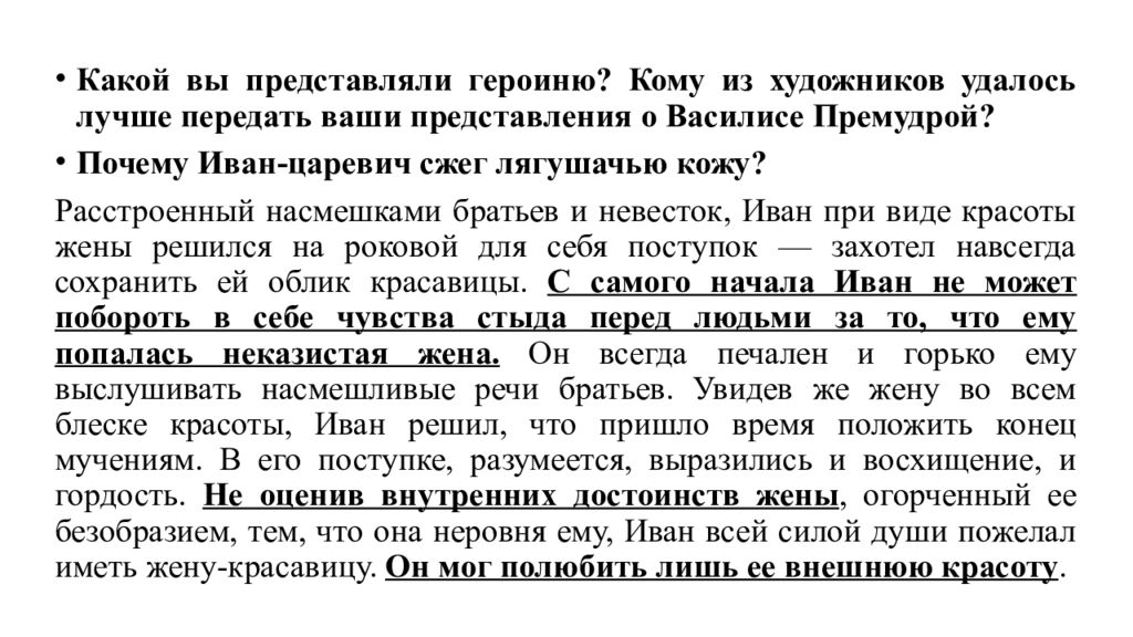 Какой вы представляли героиню? Кому из художников удалось лучше передать ваши представления о Василисе Премудрой? Почему Иван-царевич сжег лягушачью кожу? Расстроенный насмешками братьев и невесток, Иван при виде красоты жены решился на роковой для себя поступок — захотел навсегда сохранить ей облик красавицы. С самого начала Иван не может побороть в себе чувства стыда перед людьми за то, что ему попалась неказистая жена. Он всегда печален и горько ему выслушивать насмешливые речи братьев. Увидев же жену во всем блеске красоты, Иван решил, что пришло время положить конец мучениям. В его поступке, разумеется, выразились и восхищение, и гордость. Не оценив внутренних достоинств жены, огорченный ее безобразием, тем, что она неровня ему, Иван всей силой души пожелал иметь жену-красавицу. Он мог полюбить лишь ее внешнюю красоту.
