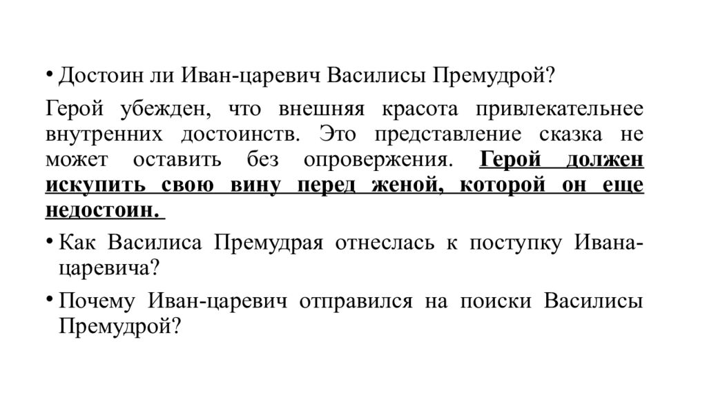 Достоин ли Иван-царевич Василисы Премудрой? Герой убежден, что внешняя красота привлекательнее внутренних достоинств. Это представление сказка не может оставить без опровержения. Герой должен искупить свою вину перед женой, которой он еще недостоин. Как Василиса Премудрая отнеслась к поступку Ивана-царевича? Почему Иван-царевич отправился на поиски Василисы Премудрой?