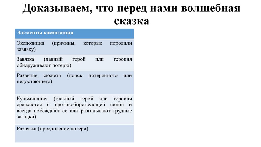 Элементы композиции Экспозиция (причины, которые породили завязку) Завязка (лавный герой или героиня обнаруживают потерю) Развитие сюжета (поиск потерянного или недостающего) Кульминация (главный герой или героиня сражаются с противоборствующей силой и всегда побеждают ее или разгадывают трудные загадки) Развязка (преодоление потери)