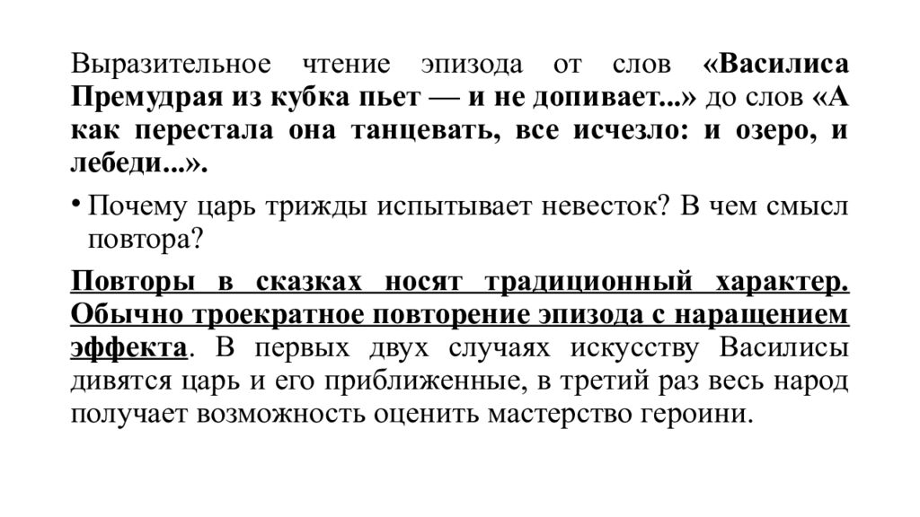 Выразительное чтение эпизода от слов «Василиса Премудрая из кубка пьет — и не допивает...» до слов «А как перестала она танцевать, все исчезло: и озеро, и лебеди...». Почему царь трижды испытывает невесток? В чем смысл повтора? Повторы в сказках носят традиционный характер. Обычно троекратное повторение эпизода с наращением эффекта. В первых двух случаях искусству Василисы дивятся царь и его приближенные, в третий раз весь народ получает возможность оценить мастерство героини.