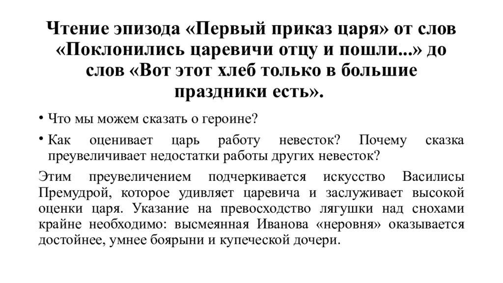 Что мы можем сказать о героине? Как оценивает царь работу невесток? Почему сказка преувеличивает недостатки работы других невесток? Этим преувеличением подчеркивается искусство Василисы Премудрой, которое удивляет царевича и заслуживает высокой оценки царя. Указание на превосходство лягушки над снохами крайне необходимо: высмеянная Иванова «неровня» оказывается достойнее, умнее боярыни и купеческой дочери.