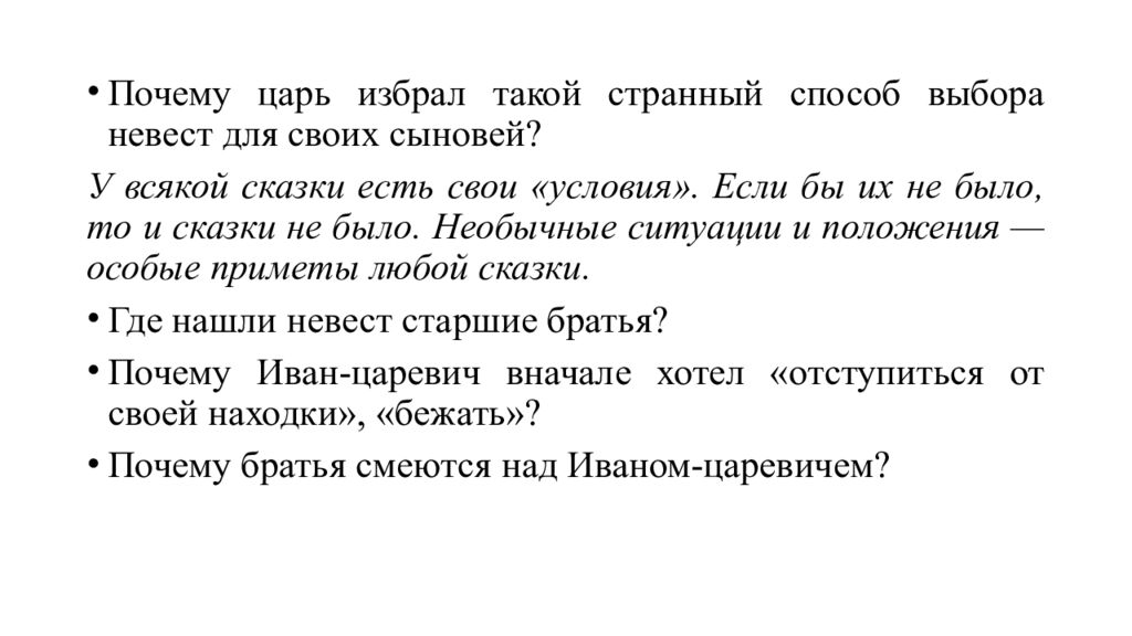 Почему царь избрал такой странный способ выбора невест для своих сыновей? У всякой сказки есть свои «условия». Если бы их не было, то и сказки не было. Необычные ситуации и положения — особые приметы любой сказки. Где нашли невест старшие братья? Почему Иван-царевич вначале хотел «отступиться от своей находки», «бежать»? Почему братья смеются над Иваном-царевичем?