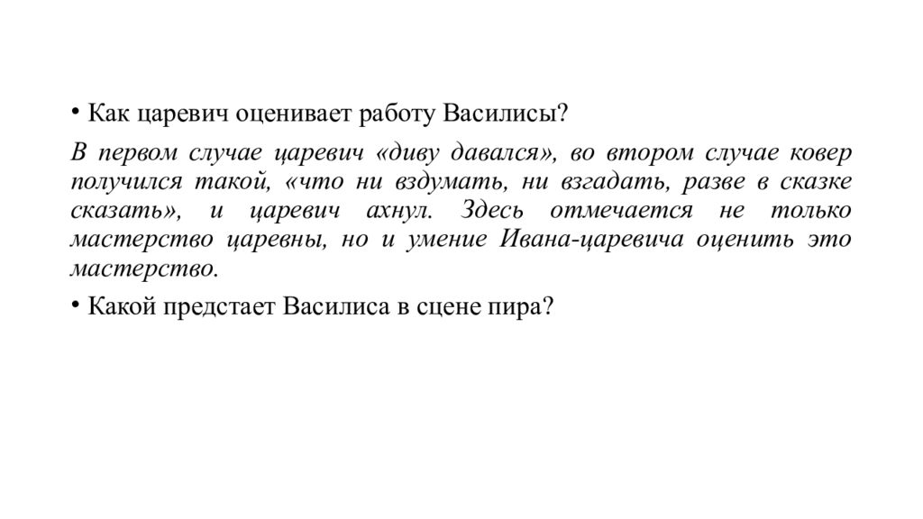Как царевич оценивает работу Василисы? В первом случае царевич «диву давался», во втором случае ковер получился такой, «что ни вздумать, ни взгадать, разве в сказке сказать», и царевич ахнул. Здесь отмечается не только мастерство царевны, но и умение Ивана-царевича оценить это мастерство. Какой предстает Василиса в сцене пира?