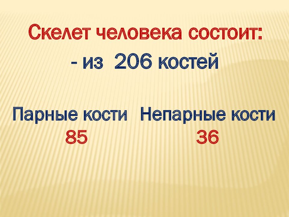 Скелет человека состоит: - из 206 костей Парные кости 85 Непарные кости 36