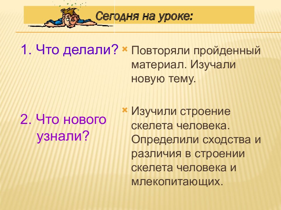 1. Что делали? 2. Что нового узнали? Повторяли пройденный материал. Изучали новую тему. Изучили строение скелета человека. Определили сходства и различия в строении скелета человека и млекопитающих. Сегодня на уроке: