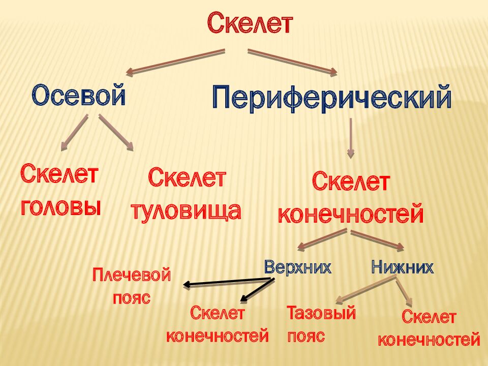 Скелет Осевой Периферический Скелет головы Скелет туловища Скелет конечностей Верхних Нижних Плечевой пояс Скелет конечностей Тазовый пояс Скелет конечностей