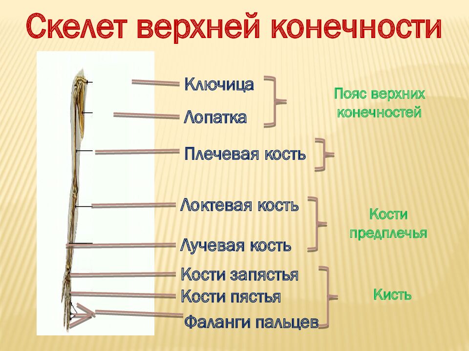 Скелет верхней конечности Ключица Лопатка Плечевая кость Локтевая кость Лучевая кость Кости запястья Кости пястья Фаланги пальцев Пояс верхних конечностей Кости предплечья Кисть