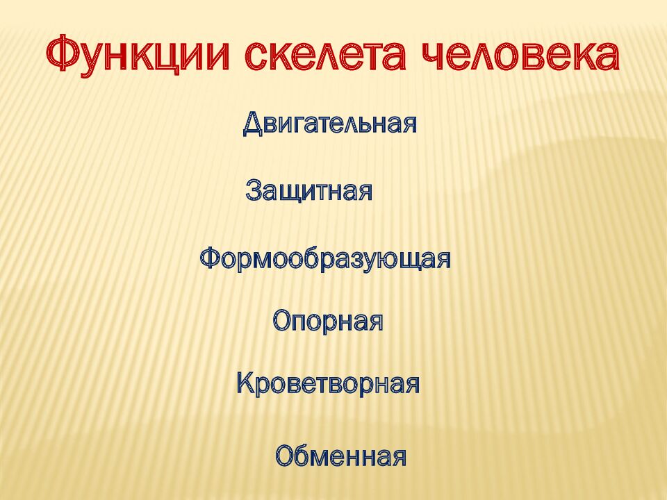 Функции скелета человека Двигательная Защитная Формообразующая Опорная Кроветворная Обменная