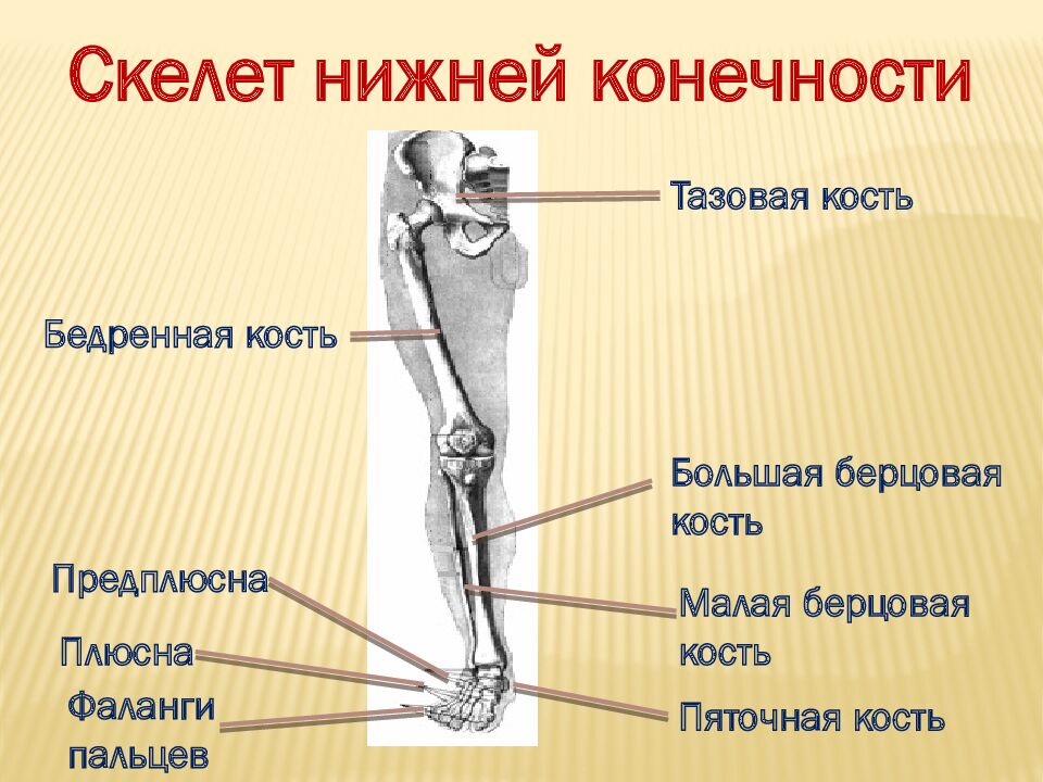 Скелет нижней конечности Тазовая кость Бедренная кость Большая берцовая кость Малая берцовая кость Предплюсна Плюсна Фаланги пальцев Пяточная кость
