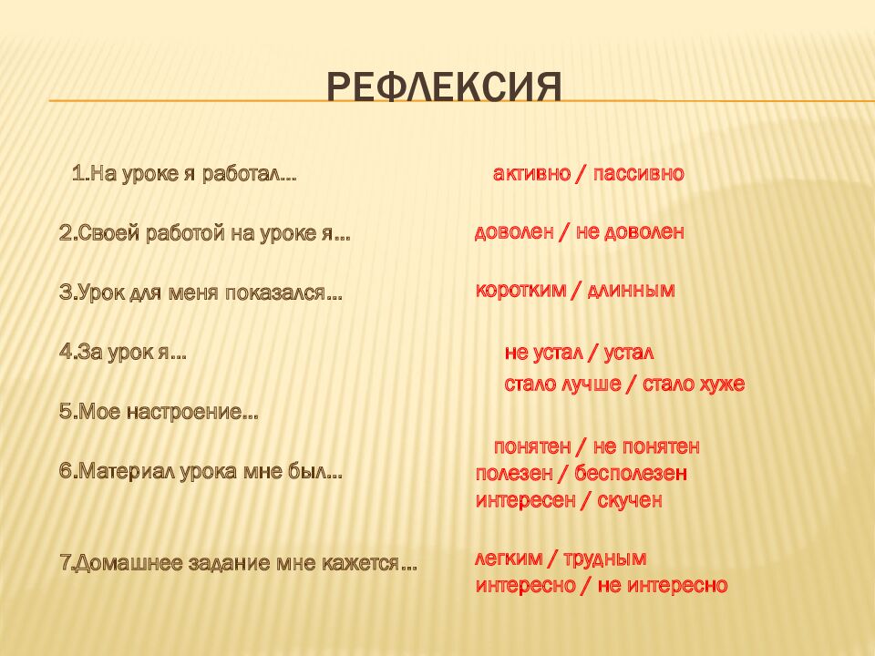 1.На уроке я работал... 2.Своей работой на уроке я… 3.Урок для меня показался… 4.За урок я… 5.Мое настроение… 6.Материал урока мне был… 7.Домашнее задание мне кажется… активно / пассивно доволен / не доволен коротким / длинным не устал / устал стало лучше / стало хуже понятен / не понятен полезен / бесполезен интересен / скучен легким / трудным интересно / не интересно