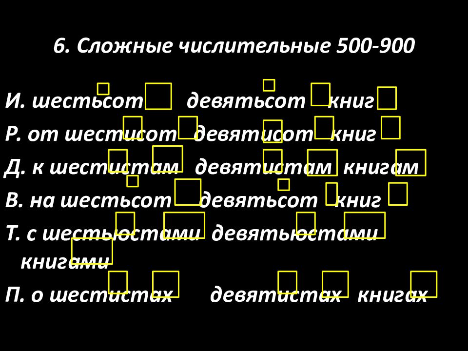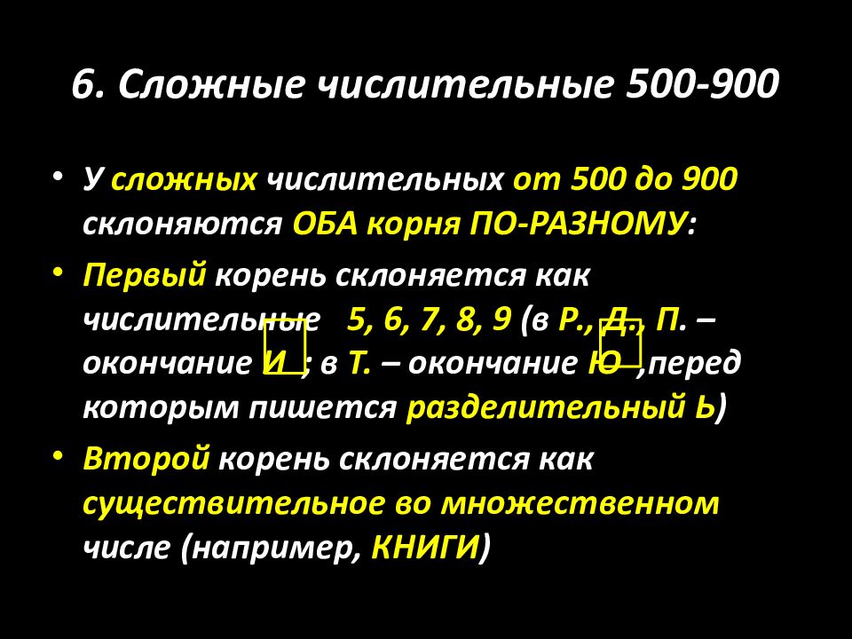 У сложных числительных от 500 до 900 склоняются ОБА корня ПО-РАЗНОМУ : Первый корень склоняется как числительные 5, 6, 7, 8, 9 (в Р., Д., П. – окончание И ; в Т. – окончание Ю,перед которым пишется разделительный Ь ) Второй корень склоняется как существительное во множественном числе (например, КНИГИ )