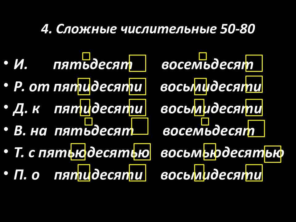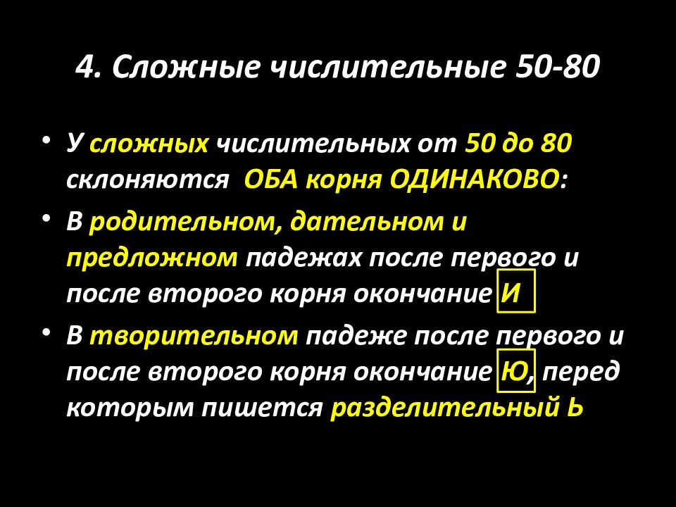 У сложных числительных от 50 до 80 склоняются ОБА корня ОДИНАКОВО : В родительном, дательном и предложном падежах после первого и после второго корня окончание И В творительном падеже после первого и после второго корня окончание Ю, перед которым пишется разделительный Ь