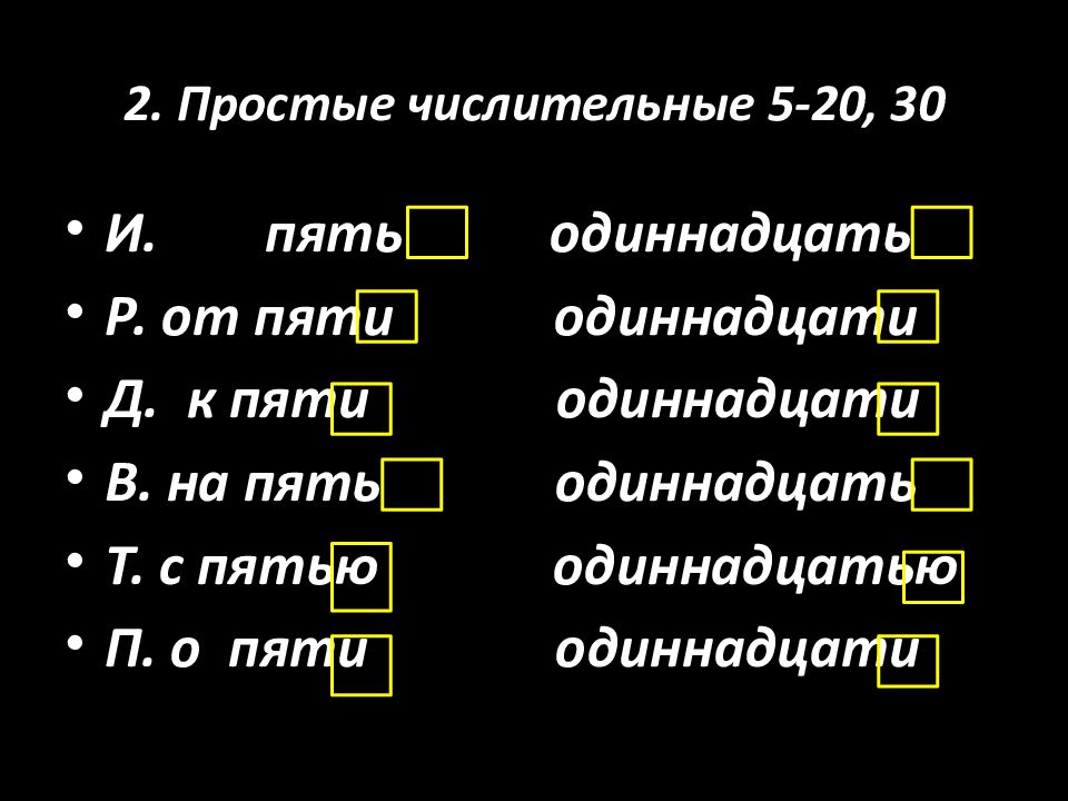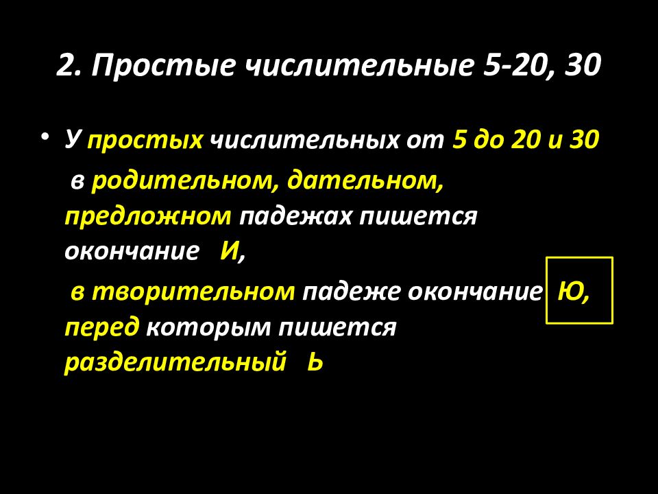 У простых числительных от 5 до 20 и 30 в родительном, дательном, предложном падежах пишется окончание И, в творительном падеже окончание Ю, перед которым пишется разделительный Ь