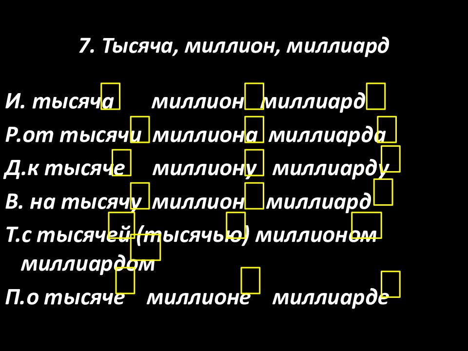 Последний слайд презентации: СКЛОНЕНИЕ КОЛИЧЕСТВЕННЫХ ЧИСЛИТЕЛЬНЫХ: 7. Тысяча, миллион, миллиард