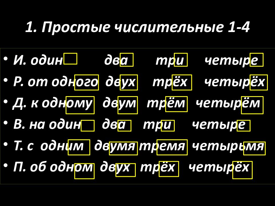 И. один два три четыре Р. от одного двух трёх четырёх Д. к одному двум трём четырём В. на один два три четыре Т. с одним двумя тремя четырьмя П. об одном двух трёх четырёх