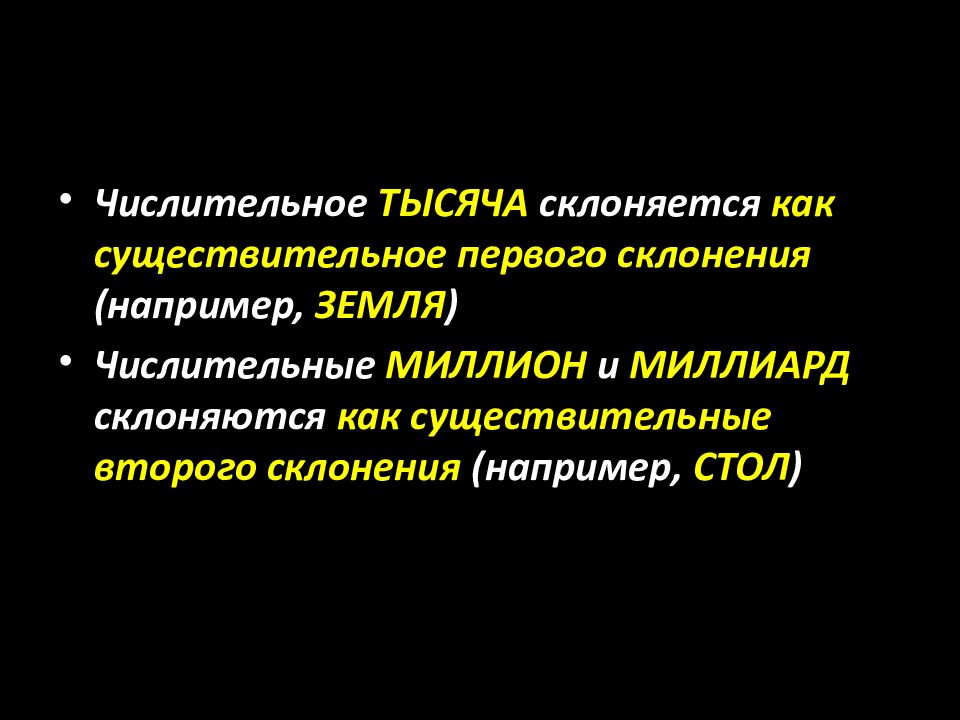Числительное ТЫСЯЧА склоняется как существительное первого склонения (например, ЗЕМЛЯ ) Числительные МИЛЛИОН и МИЛЛИАРД склоняются как существительные второго склонения (например, СТОЛ )