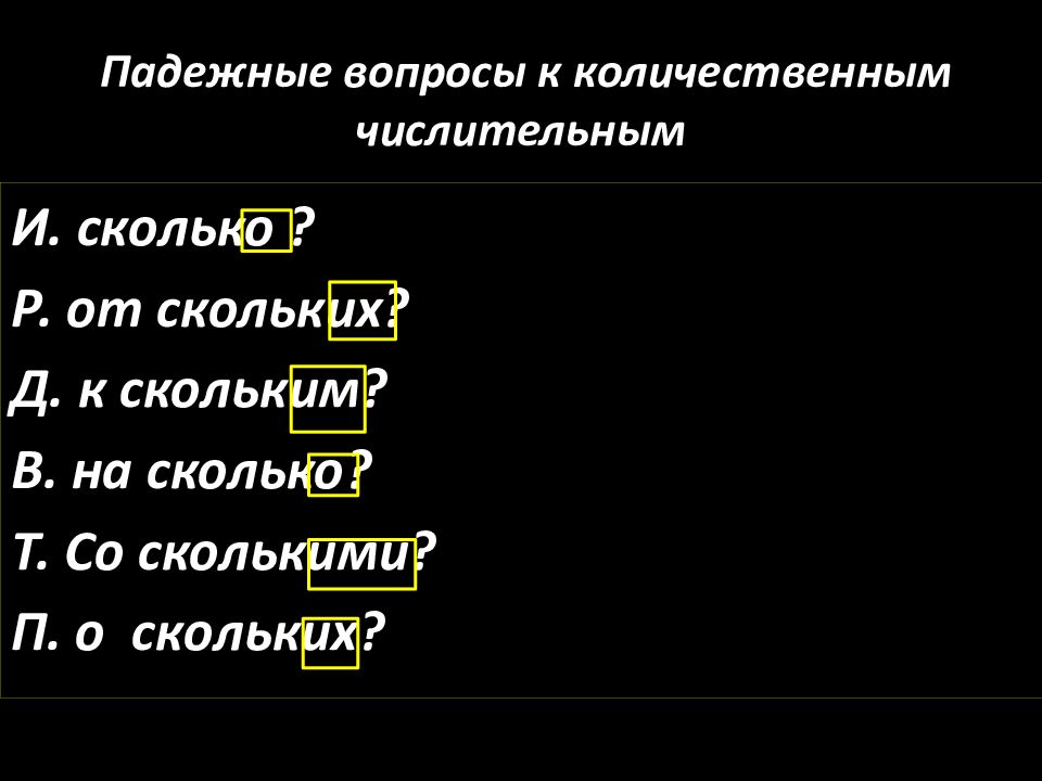 И. сколько ? Р. от скольких? Д. к скольким? В. на сколько? Т. Со сколькими? П. о скольких?