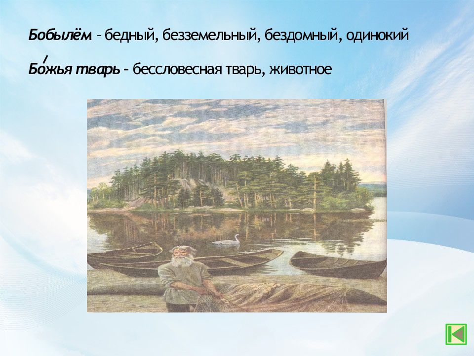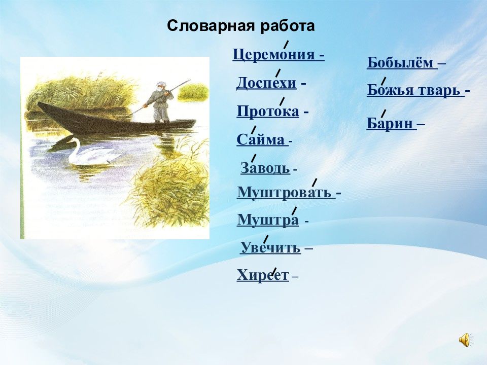 Словарная работа Церемония - Доспехи - Протока - Сайма - Заводь - Муштровать - Муштра - Увечить – Хиреет – Бобылём – Божья тварь - Барин –