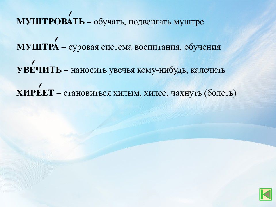 МУШТРОВАТЬ – обучать, подвергать муштре МУШТРА – суровая система воспитания, обучения ХИРЕЕТ – становиться хилым, хилее, чахнуть (болеть) УВЕЧИТЬ – наносить увечья кому-нибудь, калечить