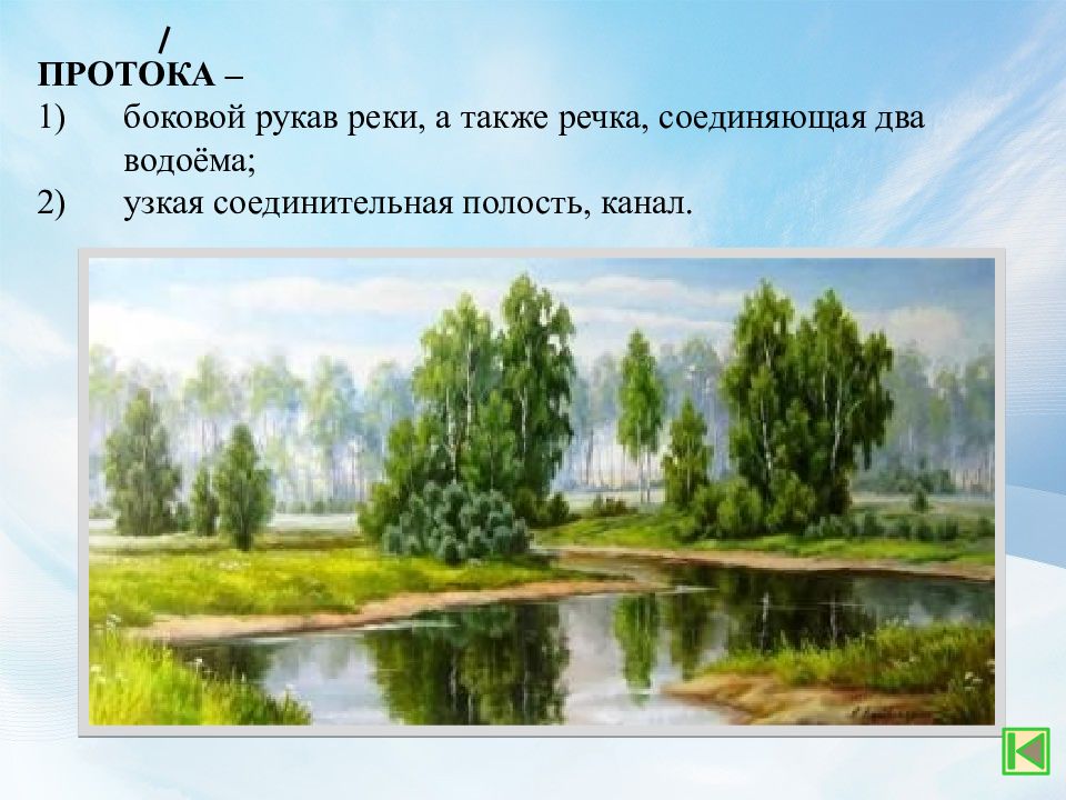 ПРОТОКА – боковой рукав реки, а также речка, соединяющая два водоёма ; узкая соединительная полость, канал.