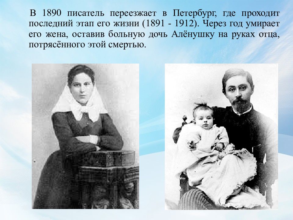 В 1890 писатель переезжает в Петербург, где проходит последний этап его жизни (1891 - 1912). Через год умирает его жена, оставив больную дочь Алёнушку на руках отца, потрясённого этой смертью.