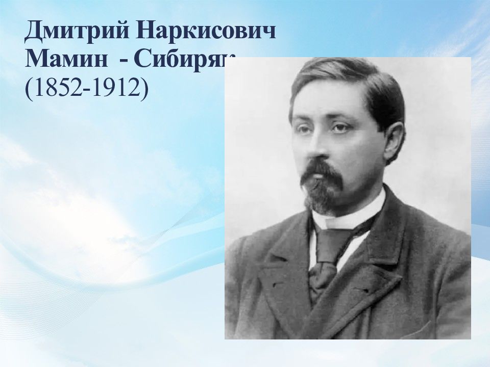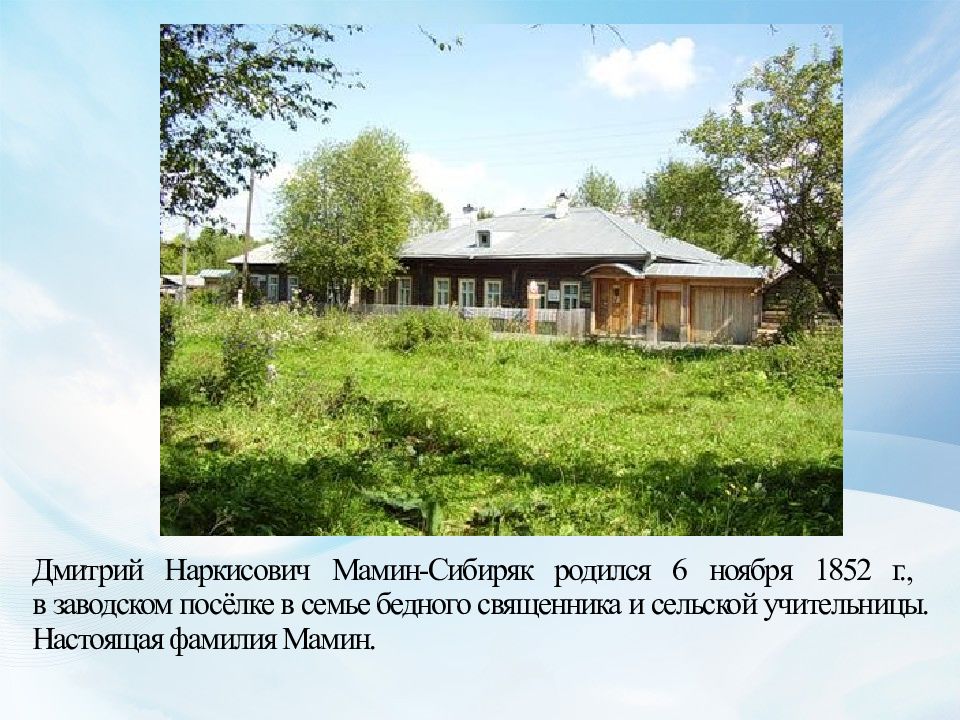 Слайд 4: Дмитрий Наркисович Мамин-Сибиряк родился 6 ноября 1852 г., в заводском посёлке в семье бедного священника и сельской учительницы. Настоящая фамилия Мамин