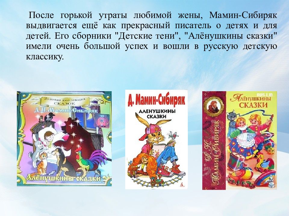 После горькой утраты любимой жены, Мамин-Сибиряк выдвигается ещё как прекрасный писатель о детях и для детей. Его сборники "Детские тени", " Алёнушкины сказки" имели очень большой успех и вошли в русскую детскую классику.