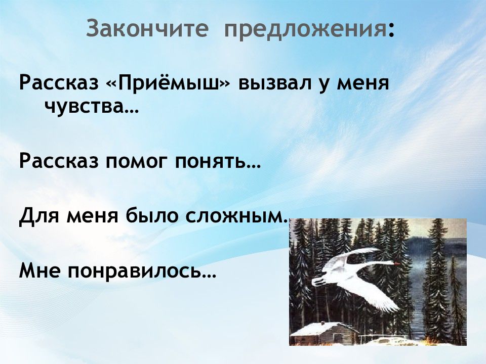 Закончите предложения : Рассказ «Приёмыш» вызвал у меня чувства… Рассказ помог понять… Для меня было сложным… Мне понравилось…