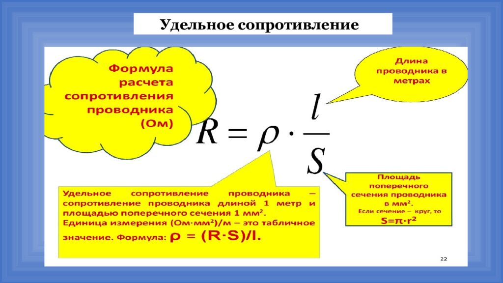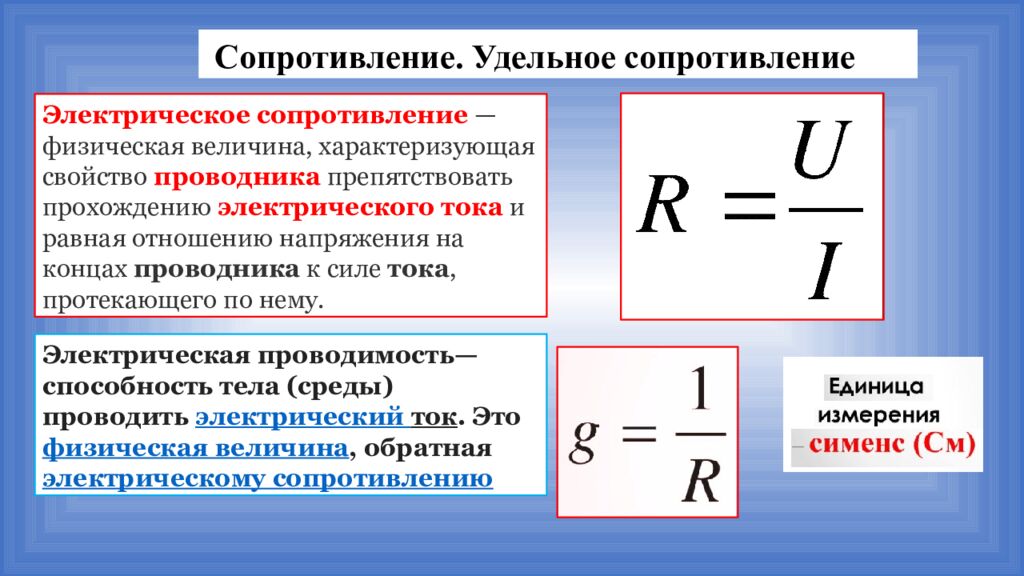 Сопротивление. Удельное сопротивление Электрическое сопротивление — физическая величина, характеризующая свойство проводника препятствовать прохождению электрического тока и равная отношению напряжения на концах проводника к силе тока, протекающего по нему. Э лектрическая проводимость— способность тела (среды) проводить электрический ток. Это физическая величина, обратная электрическому сопротивлению