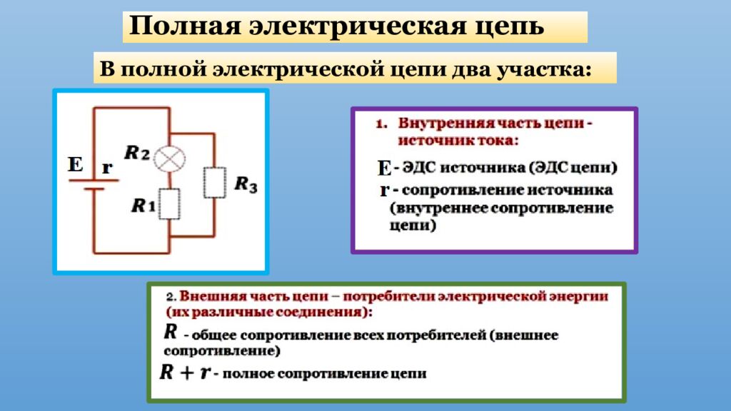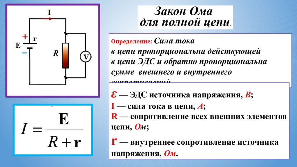 Закон Ома для полной цепи. Определение: Сила тока в цепи пропорциональна действующей в цепи ЭДС и обратно пропорциональна сумме внешнего и внутреннего сопротивлений. ε — ЭДС источника напряжения, В ; I — сила тока в цепи, А ; R — сопротивление всех внешних элементов цепи, О м ; r — внутреннее сопротивление источника напряжения, Ом.