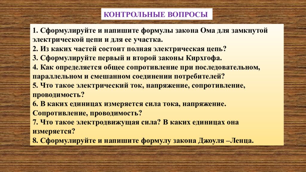 1. Сформулируйте и напишите формулы закона Ома для замкнутой электрической цепи и для ее участка. 2. Из каких частей состоит полная электрическая цепь? 3. Сформулируйте первый и второй законы Кирхгофа. 4. Как определяется общее сопротивление при последовательном, параллельном и смешанном соединении потребителей? 5. Что такое электрический ток, напряжение, сопротивление, проводимость? 6. В каких единицах измеряется сила тока, напряжение. Сопротивление, проводимость? 7. Что такое электродвижущая сила? В каких единицах она измеряется? 8. Сформулируйте и напишите формулу закона Джоуля –Ленца. КОНТРОЛЬНЫЕ ВОПРОСЫ