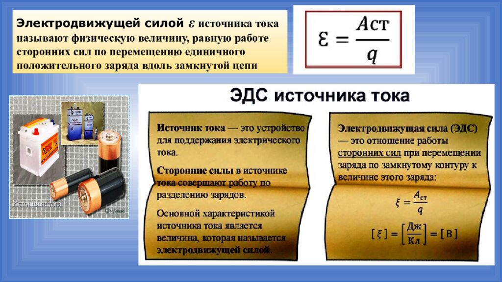 Электродвижущей силой ε источника тока называют физическую величину, равную работе сторонних сил по перемещению единичного положительного заряда вдоль замкнутой цепи