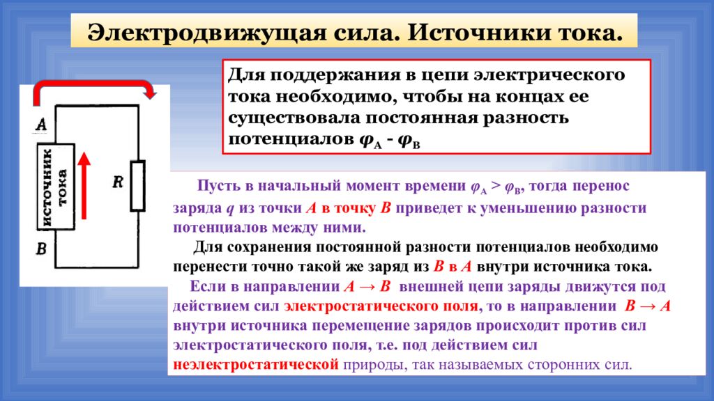 Электродвижущая сила. Источники тока. Пусть в начальный момент времени φ A > φ B, тогда перенос заряда q из точки А в точку В приведет к уменьшению разности потенциалов между ними. Для сохранения постоянной разности потенциалов необходимо перенести точно такой же заряд из B в A в нутри источника тока. Если в направлении А → В внешней цепи заряды движутся под действием сил электростатического поля, то в направлении В → А внутри источника перемещение зарядов происходит против сил электростатического поля, т.е. под действием сил неэлектростатической природы, так называемых сторонних сил. Для поддержания в цепи электрического тока необходимо, чтобы на концах ее существовала постоянная разность потенциалов φ A - φ B
