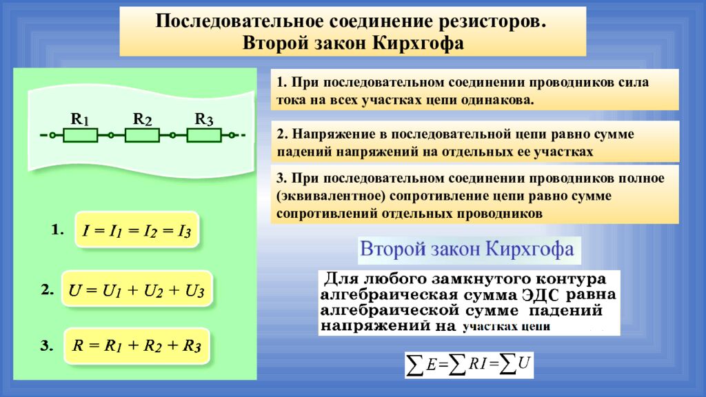 Последовательное соединение резисторов. Второй закон Кирхгофа 1. При последовательном соединении проводников сила тока на всех участках цепи одинакова. 2. Напряжение в последовательной цепи равно сумме падений напряжений на отдельных ее участках 3. При последовательном соединении проводников полное (эквивалентное) сопротивление цепи равно сумме сопротивлений отдельных проводников
