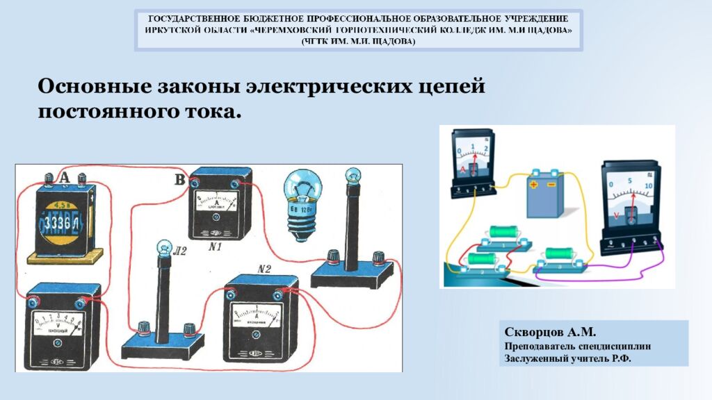 Скворцов А.М. Преподаватель спецдисциплин Заслуженный учитель Р.Ф. Основные законы электрических цепей постоянного тока.