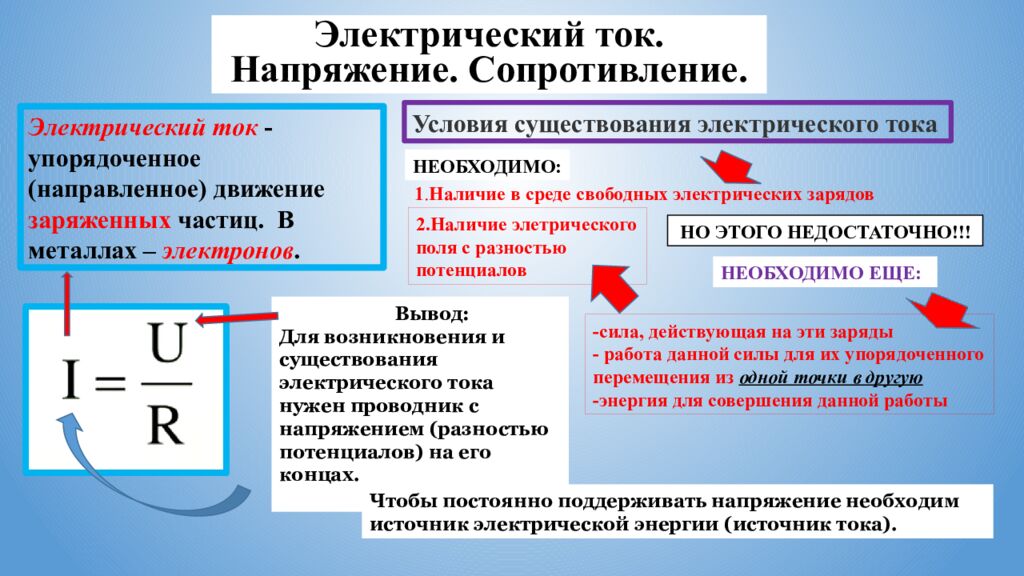Электрический ток. Напряжение. Сопротивление. Электрический ток -упорядоченное (направленное) движение заряженных частиц. В металлах – электронов. Условия существования электрического тока НЕОБХОДИМО: НЕОБХОДИМО ЕЩЕ: НО ЭТОГО НЕДОСТАТОЧНО!!! -сила, действующая на эти заряды - работа данной силы для их упорядоченного перемещения из одной точки в другую -энергия для совершения данной работы 2.Наличие элетрического поля с разностью потенциалов Вывод: Для возникновения и существования электрического тока н ужен проводник с напряжением (разностью потенциалов) на его концах. Чтобы постоянно поддерживать напряжение необходим источник электрической энергии (источник тока). 1. Наличие в среде свободных электрических зарядов