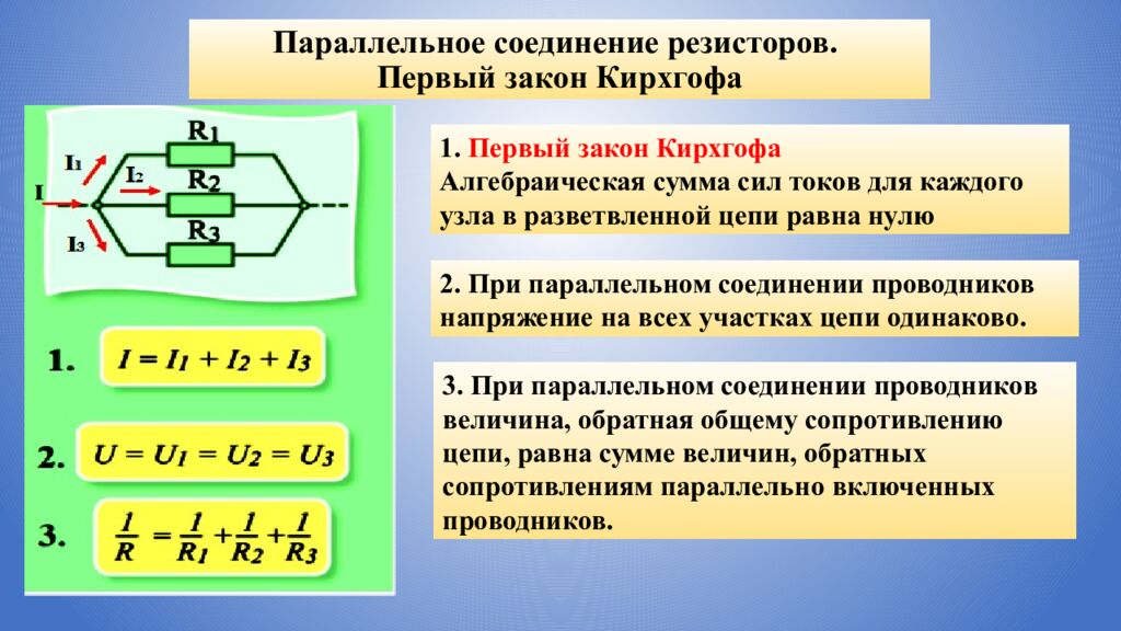 Параллельное соединение резисторов. Первый закон Кирхгофа 2. При параллельном соединении проводников напряжение на всех участках цепи одинаково. 3. При параллельном соединении проводников величина, обратная общему сопротивлению цепи, равна сумме величин, обратных сопротивлениям параллельно включенных проводников. 1. Первый закон Кирхгофа Алгебраическая сумма сил токов для каждого узла в разветвленной цепи равна нулю