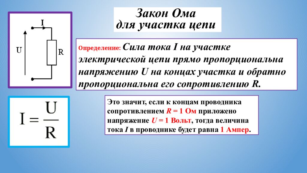 Закон Ома для участка цепи Определение : Сила тока I на участке электрической цепи прямо пропорциональна напряжению U на концах участка и обратно пропорциональна его сопротивлению R. Это значит, если к концам проводника сопротивлением R = 1 Ом приложено напряжение U = 1 Вольт, тогда величина тока I в проводнике будет равна 1 Ампер.