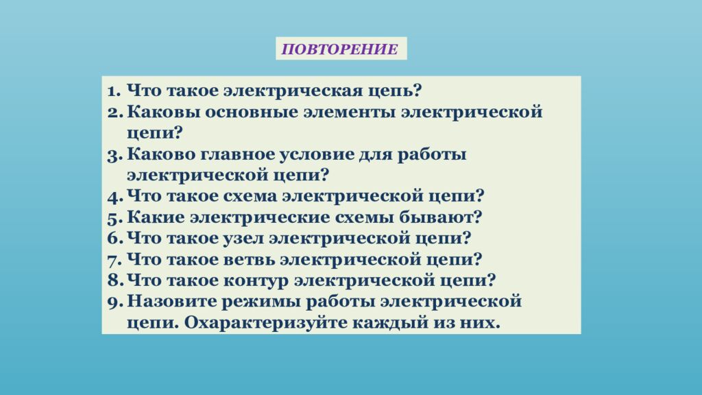 ПОВТОРЕНИЕ Что такое электрическая цепь? Каковы основные элементы электрической цепи? Каково главное условие для работы электрической цепи? Что такое схема электрической цепи? Какие электрические схемы бывают? Что такое узел электрической цепи? Что такое ветвь электрической цепи? Что такое контур электрической цепи? Назовите режимы работы электрической цепи. Охарактеризуйте каждый из них.