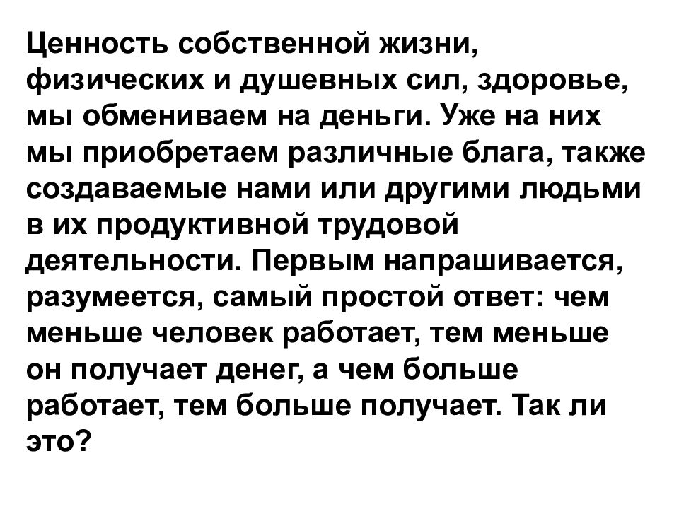 Ценность собственной жизни, физических и душевных сил, здоровье, мы обмениваем на деньги. Уже на них мы приобретаем различные блага, также создаваемые нами или другими людьми в их продуктивной трудовой деятельности. Первым напрашивается, разумеется, самый простой ответ: чем меньше человек работает, тем меньше он получает денег, а чем больше работает, тем больше получает. Так ли это?