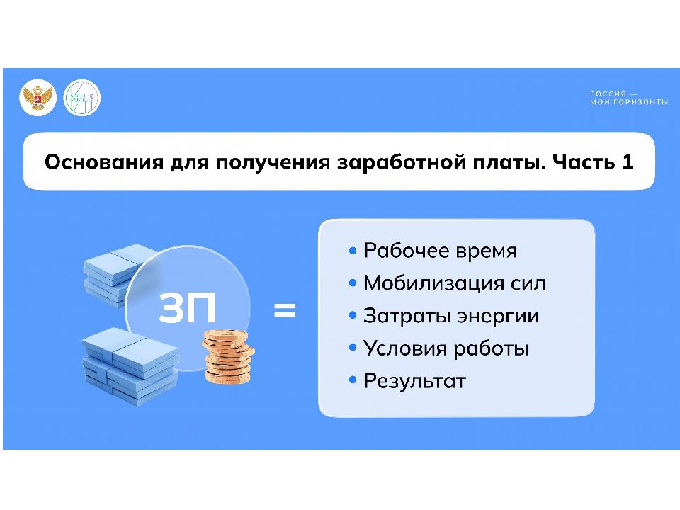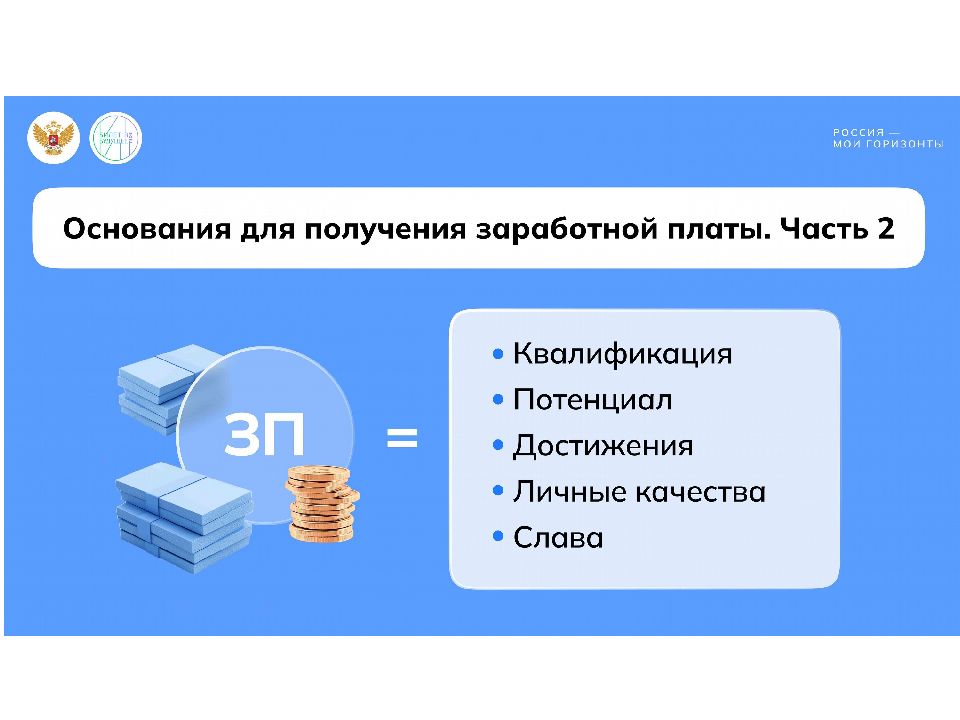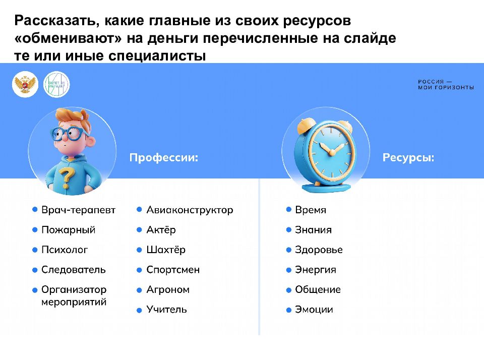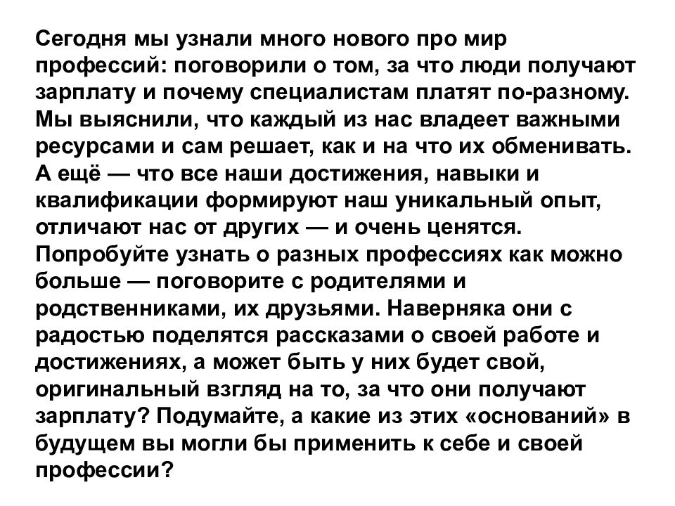 Сегодня мы узнали много нового про мир профессий: поговорили о том, за что люди получают зарплату и почему специалистам платят по-разному. Мы выяснили, что каждый из нас владеет важными ресурсами и сам решает, как и на что их обменивать. А ещё — что все наши достижения, навыки и квалификации формируют наш уникальный опыт, отличают нас от других — и очень ценятся. Попробуйте узнать о разных профессиях как можно больше — поговорите с родителями и родственниками, их друзьями. Наверняка они с радостью поделятся рассказами о своей работе и достижениях, а может быть у них будет свой, оригинальный взгляд на то, за что они получают зарплату? Подумайте, а какие из этих «оснований» в будущем вы могли бы применить к себе и своей профессии?