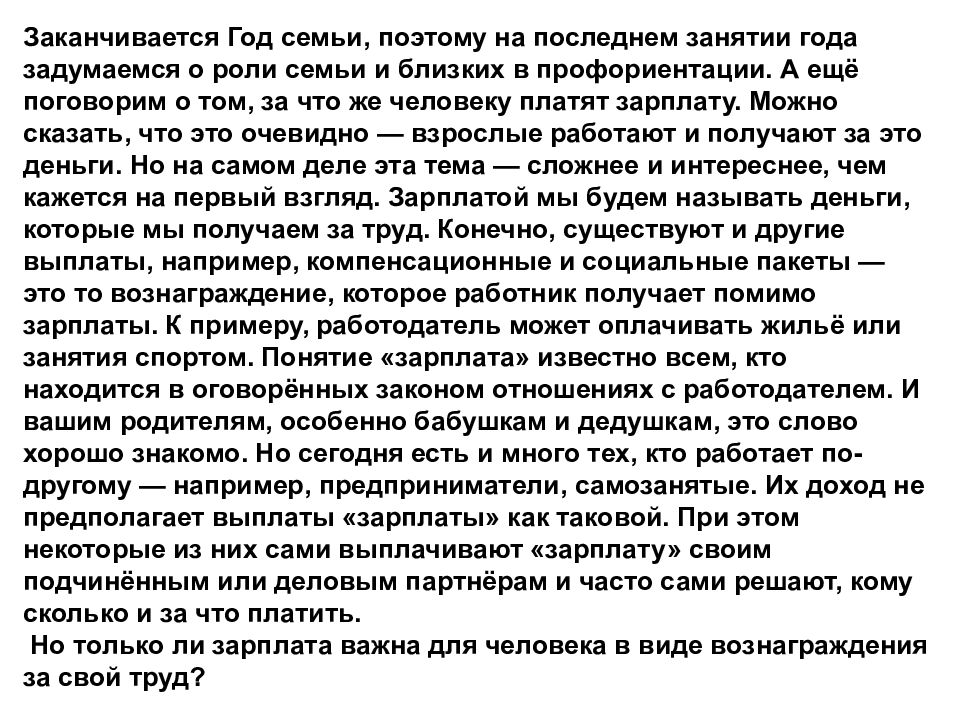 Заканчивается Год семьи, поэтому на последнем занятии года задумаемся о роли семьи и близких в профориентации. А ещё поговорим о том, за что же человеку платят зарплату. Можно сказать, что это очевидно — взрослые работают и получают за это деньги. Но на самом деле эта тема — сложнее и интереснее, чем кажется на первый взгляд. Зарплатой мы будем называть деньги, которые мы получаем за труд. Конечно, существуют и другие выплаты, например, компенсационные и социальные пакеты — это то вознаграждение, которое работник получает помимо зарплаты. К примеру, работодатель может оплачивать жильё или занятия спортом. Понятие «зарплата» известно всем, кто находится в оговорённых законом отношениях с работодателем. И вашим родителям, особенно бабушкам и дедушкам, это слово хорошо знакомо. Но сегодня есть и много тех, кто работает по-другому — например, предприниматели, самозанятые. Их доход не предполагает выплаты «зарплаты» как таковой. При этом некоторые из них сами выплачивают «зарплату» своим подчинённым или деловым партнёрам и часто сами решают, кому сколько и за что платить. Но только ли зарплата важна для человека в виде вознаграждения за свой труд?