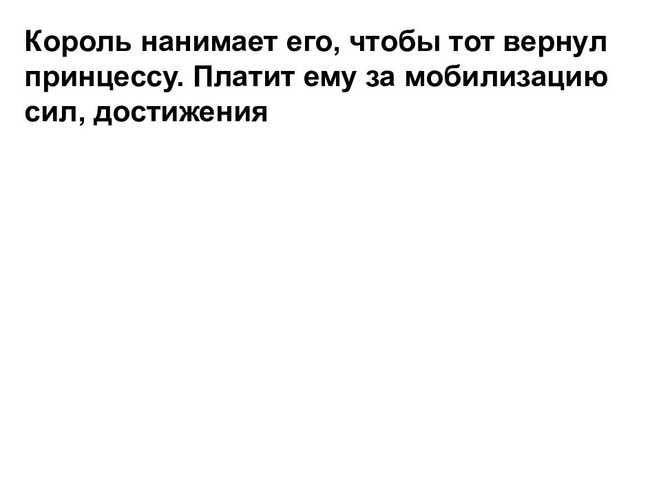 Король нанимает его, чтобы тот вернул принцессу. Платит ему за мобилизацию сил, достижения