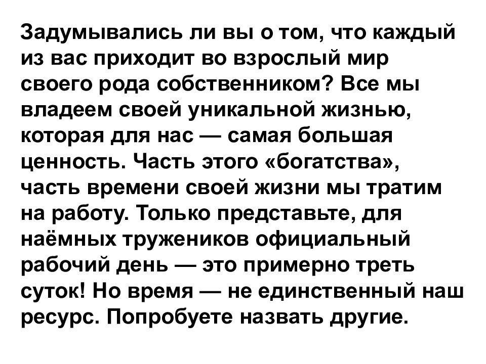 Задумывались ли вы о том, что каждый из вас приходит во взрослый мир своего рода собственником? Все мы владеем своей уникальной жизнью, которая для нас — самая большая ценность. Часть этого «богатства», часть времени своей жизни мы тратим на работу. Только представьте, для наёмных тружеников официальный рабочий день — это примерно треть суток! Но время — не единственный наш ресурс. Попробуете назвать другие.