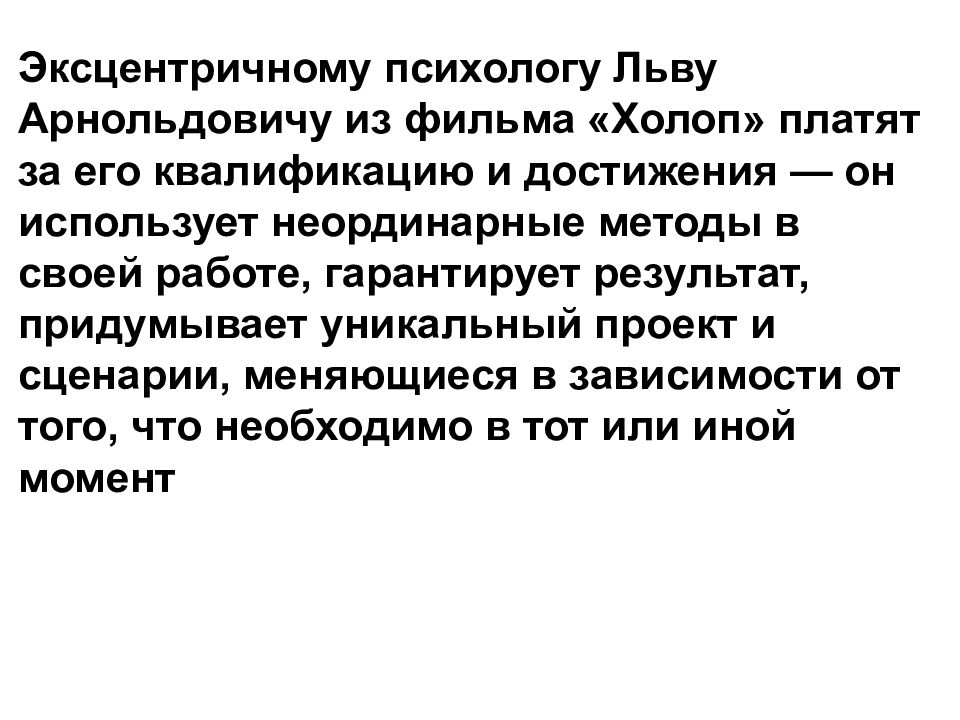Эксцентричному психологу Льву Арнольдовичу из фильма «Холоп» платят за его квалификацию и достижения — он использует неординарные методы в своей работе, гарантирует результат, придумывает уникальный проект и сценарии, меняющиеся в зависимости от того, что необходимо в тот или иной момент
