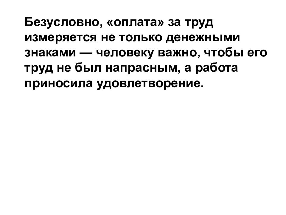 Безусловно, «оплата» за труд измеряется не только денежными знаками — человеку важно, чтобы его труд не был напрасным, а работа приносила удовлетворение.