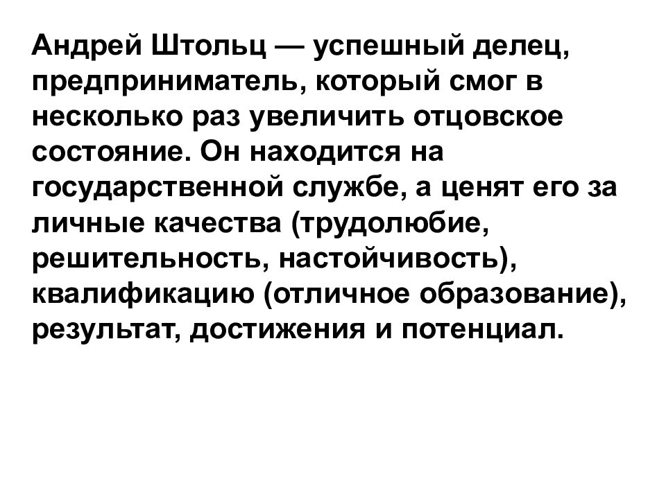 Андрей Штольц — успешный делец, предприниматель, который смог в несколько раз увеличить отцовское состояние. Он находится на государственной службе, а ценят его за личные качества (трудолюбие, решительность, настойчивость), квалификацию (отличное образование), результат, достижения и потенциал.