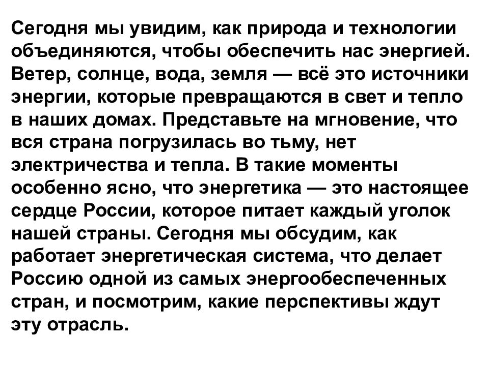 Сегодня мы увидим, как природа и технологии объединяются, чтобы обеспечить нас энергией. Ветер, солнце, вода, земля — всё это источники энергии, которые превращаются в свет и тепло в наших домах. Представьте на мгновение, что вся страна погрузилась во тьму, нет электричества и тепла. В такие моменты особенно ясно, что энергетика — это настоящее сердце России, которое питает каждый уголок нашей страны. Сегодня мы обсудим, как работает энергетическая система, что делает Россию одной из самых энергообеспеченных стран, и посмотрим, какие перспективы ждут эту отрасль.